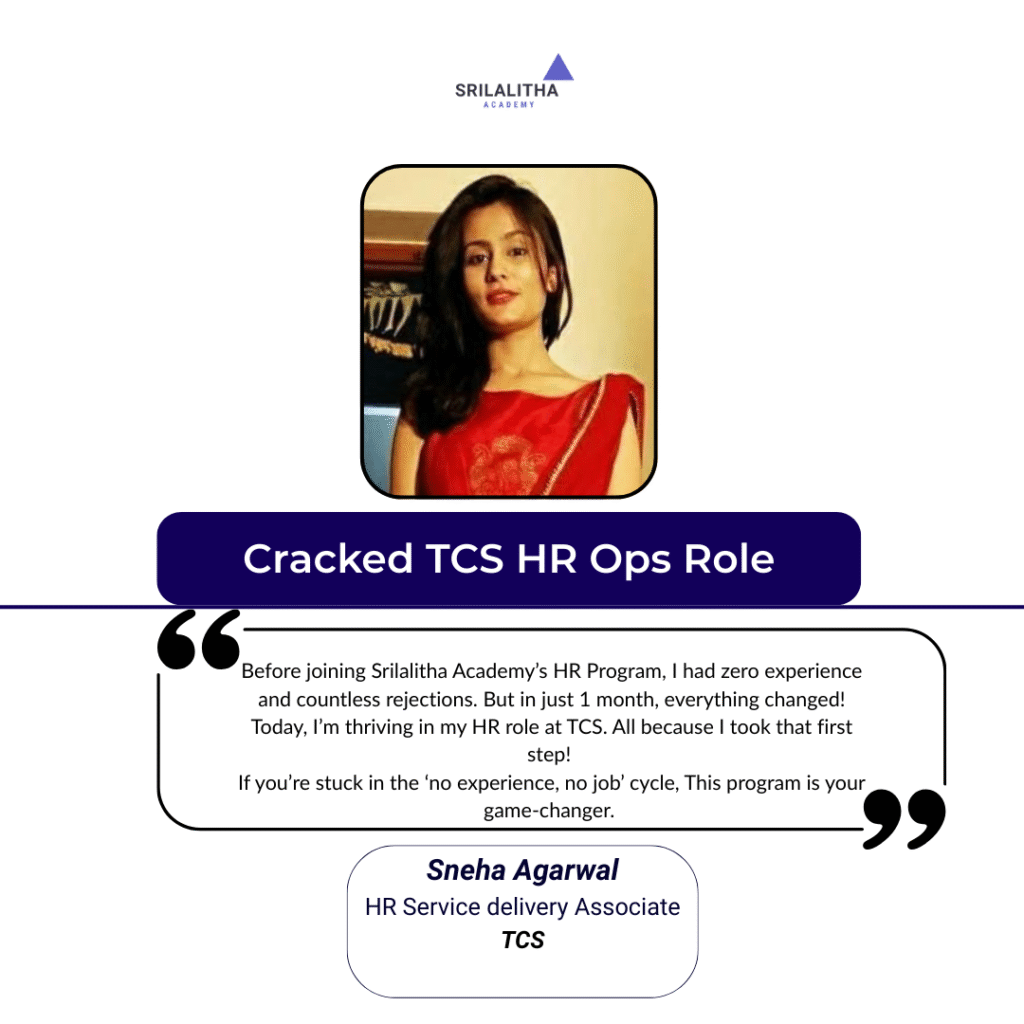 “”This course was a game-changer for me! The in-depth training on Talent Acquisition and HR Operations helped me gain real-world HR skills. The mentorship and job-ready guidance gave me the confidence to excel in interviews. I’m thrilled to have landed an HR role at TCS, and I owe it all to this amazing program!”